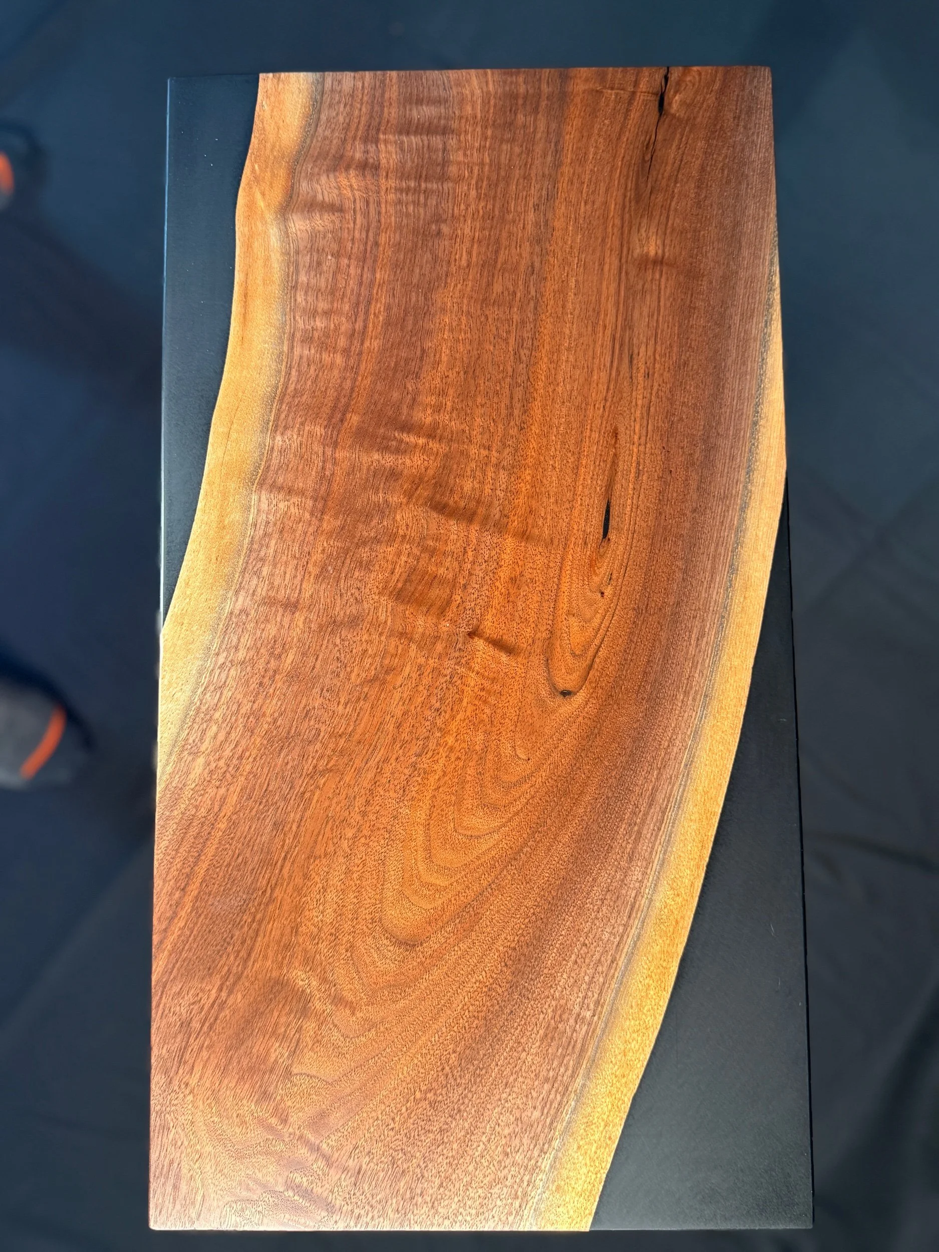 This slab of Wisconsin Black Walnut was nearly lost to the fireplace before being salvaged and given a second life. Instead of burning away in an instant, its grain now glows against a deep-black resin frame—like embers preserved in glass. The resin doesn’t divide the wood in a river; it surrounds it, heightening the warmth and making the walnut the unmistakable centerpiece.